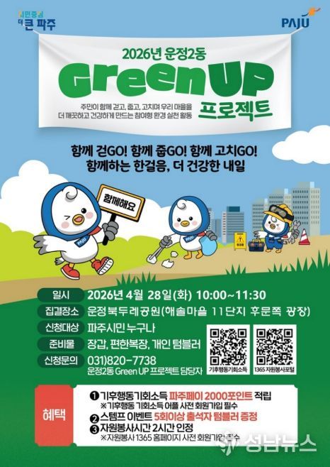 파주시 운정2동은 오는 28일 10시부터 운정 북두레공원에서 주민과 함께하는 시민 참여형 환경·건강 프로그램 ‘제3회 그린 업(Green UP) 프로젝트’를 개최한다.
