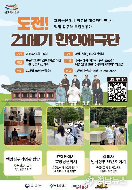 서울 용산구가 내달부터 11월까지 지역 내 국가유산 서울 효창공원(효창원로 177-18) 일대에서 ’효창공원이 생생, 독립운동이 생생‘ 프로그램을 운영한다.