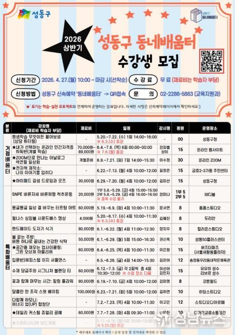 서울 성동구가 올해 약 3,800만 원의 예산을 투입해 주민 주도형 평생학습 생태계를 조성하는 ‘2026년 성동구 동네배움터’ 운영에 본격적으로 나선다고 밝혔다.