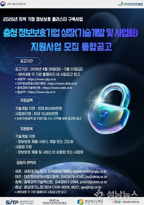 세종테크노파크는 정보보호 유망기업 발굴 및 성장 지원을 위해 ‘정보보호 성장(기술개발 및 사업화) 지원사업’ 충청권 통합공고를 4월 28일부터 진행한다고 밝혔다.