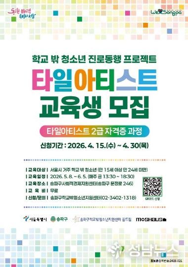 송파구는 서울시 ‘약자와의 동행’ 공모사업으로 학교 밖 청소년들의 사회진입과 자립을 돕기 위한 ‘타일아티스트 교육’을 실시한다고 24일 밝혔다.