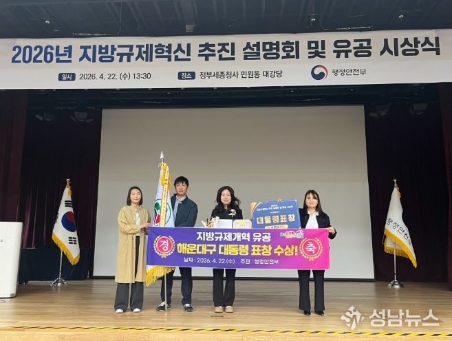 해운대구 관계자는 “이번 대통령 표창은 규제 해소를 위해 현장에서 묵묵히 노력해 온 직원들이 함께 이뤄낸 값진 성과”라며 “앞으로도 구민과 기업이 체감할 수 있는 실질적인 규제혁신 및 적극행정을 지속적으로 추진해 지역 경쟁력과 행정 신뢰도를 높여 나가겠다”고 말했다.