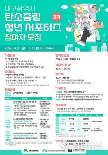 대구광역시는 기후위기 대응과 탄소중립 실천문화 확산을 위해 ‘대구시 탄소중립 청년 서포터즈 3기’ 참여자를 5월 11일까지 모집한다.