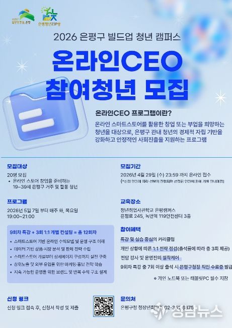 프로그램은 다음 달 7일부터 주 2회 운영된다. 모집 대상은 온라인 스토어 창업·부업을 준비하는 19세부터 39세까지 청년으로, 은평구 거주자를 우선 선발해 총 20명을 모집한다. 신청은 홍보물 내 큐알(QR)코드를 통해 온라인으로 접수하면 된다.