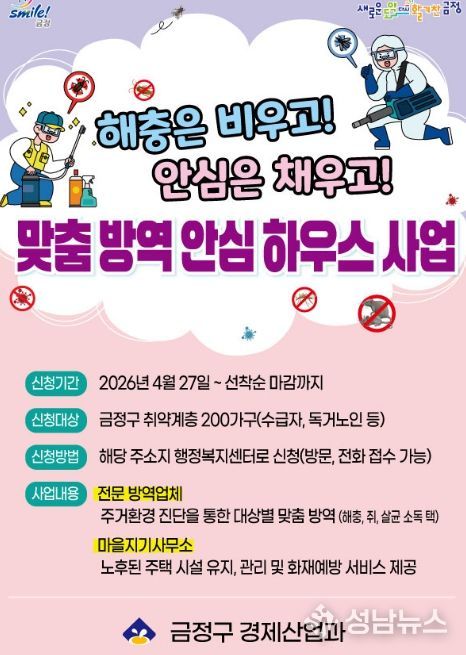 ‘맞춤 방역 안심하우스’는 단순 방역을 넘어 가구별 여건을 반영한 맞춤형 지원이 특징이다. 대상 가구의 주거 환경을 사전 진단한 뒤 ▲해충(바퀴벌레 등) ▲쥐 방역 ▲살균 방역 중 필요한 서비스를 제공하며, 필요시 노후 주택의 소규모 유지·관리와 화재 예방 물품도 함께 지원한다.