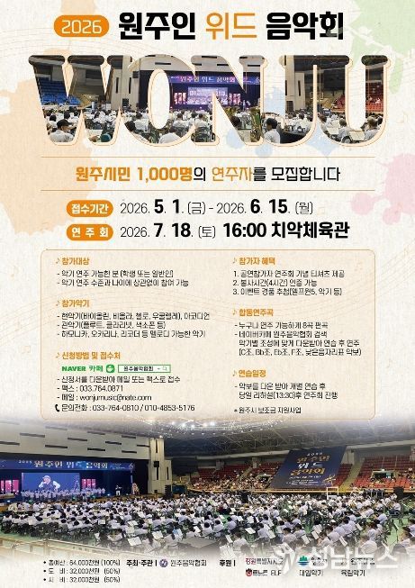 (사)한국음악협회 원주지부는 오는 7월 18일 열리는 ‘2026 원주인 위드 음악회’에 참여할 시민 연주자 1,000명을 모집한다.