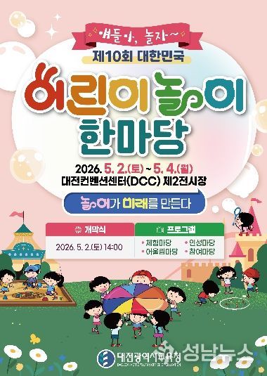 대전시교육청은 제104회 어린이날을 맞아 오는 5월 2일부터 4일까지 3일간 대전컨벤션센터(DCC) 제2전시장에서 ‘제10회 대한민국 어린이 놀이 한마당’을 개최한다고 밝혔다.