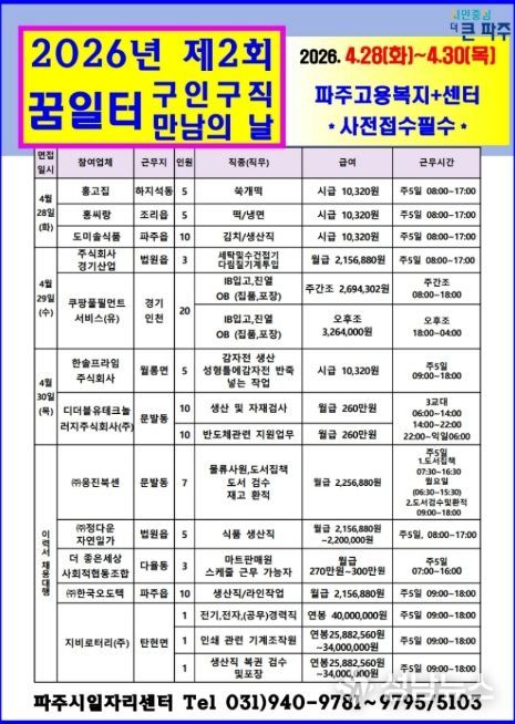 파주시는 오는 28일부터 30일까지 파주고용복지플러스센터(금촌동 엠에이치(MH)타워 8층)에서 2026년 제2회 ‘구인·구직 만남의 날’을 개최한다.