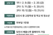 성남뉴스 관리자 기자 | 당진시는 사교육비로 인한 부모들의 경제적 부담 덜기 위해 당진시 중고등학생과 학교 밖 청소년을 대상으로 ‘강남인강’ 수강료를 지원한다고 6일 밝혔다. 신청 기간은 △1차 2월 9일~20일 △2차 5월 11일~20일 △3차 10월 12일~21일까지며, 평생학습 통합 플랫폼 ‘배움나루’ 누리집에서 신청하면 된다. 연 수강료는 공동이용 협약 체결도시 혜택으로 3만 원이며 시에서 2만 원을 지원, 수강생은 1만 원만 납부하면 된다. 단, 기초생활수급자, 차상위계층, 한부모가족, 학교 밖 청소년 등 무료 수강 지원 대상자는 자부담이 없으므로 해당자는 배움나루에서 감면 여부를 조회한 뒤 신청하면 된다. 수강 신청을 한 중고생은 발급받은 온라인 강의 수강권을 강남인강 누리집에 등록하면 1년간 국어, 영어, 수학, 사회, 과학 등 모든 강의 콘텐츠를 무제한으로 수강할 수 있다. 한편, 강남인강은 중학교 1학년부터 고등학교 3학년까지 총 1,265개 강좌를 지원하고 있으며 수강생은 개념완성·심화학습·문제 풀이 과정의 난이도별 강좌를 골라 학년별, 과목별로 학습할 수 있다.