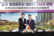 - 신상진 성남시장과 경제·산업 협력 확대 방안 등 논의 성남시(시장 신상진)는 국제 자매도시인 중국 후이저우시 대표단(단장 돤즈후이 부시장. 총 6명)이 성남 국제 바이오헬스케어 컨벤션(10.23~24) 행사 참관을 위해 지역을 방문했다고 24일 밝혔다. 이번 방문은 성남시와 후이저우시가 2016년 우호협력도시 협약을 체결하고서 올해 6월 자매결연 협약 체결로 관계를 격상한 뒤 성남시의 초청으로 이뤄진 첫 공식 교류 일정이다. 중국 후이저우시 부시장 일행은 10월 23일 오후 2시 성남 국제 바이오헬스케어 컨벤션 현장인 성남글로벌융합센터(시흥동)를 찾았다. 돤즈후이 중국 후이저우시 부시장은 컨벤션 개막식에서 “성남시와 후이저우시는 한국과 중국을 대표하는 혁신 산업도시”라면서 “향후 양 도시의 기술혁신과 연구개발을 중심으로 상생 협력을 강화해 나가길 바란다”는 내용의 축사를 했다. 대표단은 이어 △16개국 51명의 바이어가 참여한 수출상담회 △50개 부스의 의료기기, 인공지능(AI)·디지털 헬스케어, 바이오헬스케어 제품 전시장 △비즈니스 교류회 등을 참관했다. 성남시청 4층 시장 집무실을 방문해 신상진 성남시장과 간담회를 하고, 경제·산업 협력 확대와 혁신